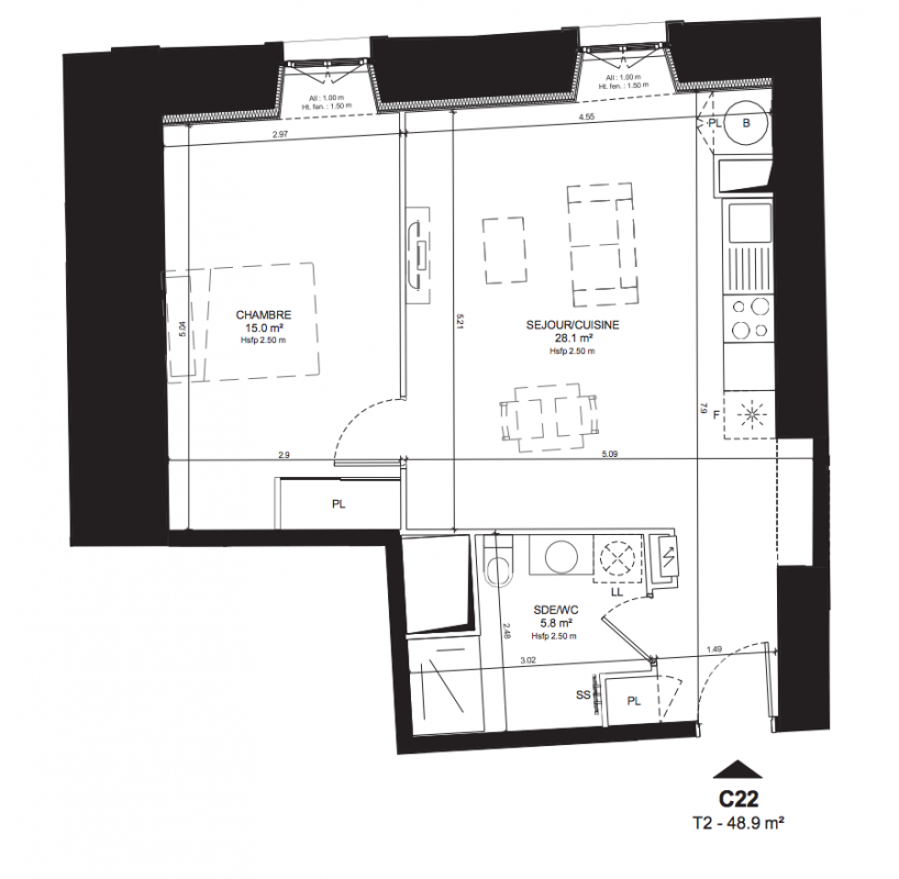364 000€ Appt. T2 48.2m2 1er